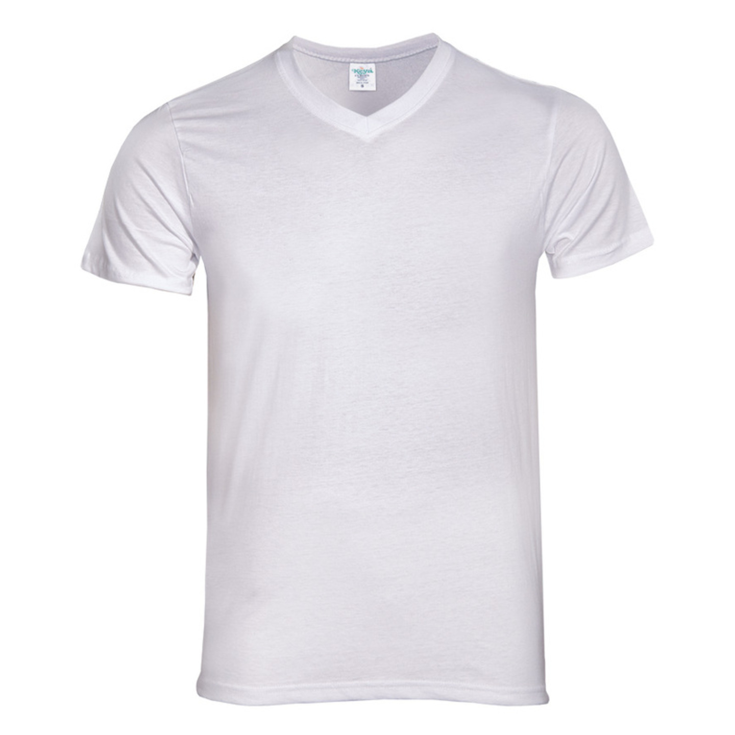 Men's short sleeve T-shirt with 'V' neckline , without seams on the side (tubular) and double seam from shoulder to shoulder.