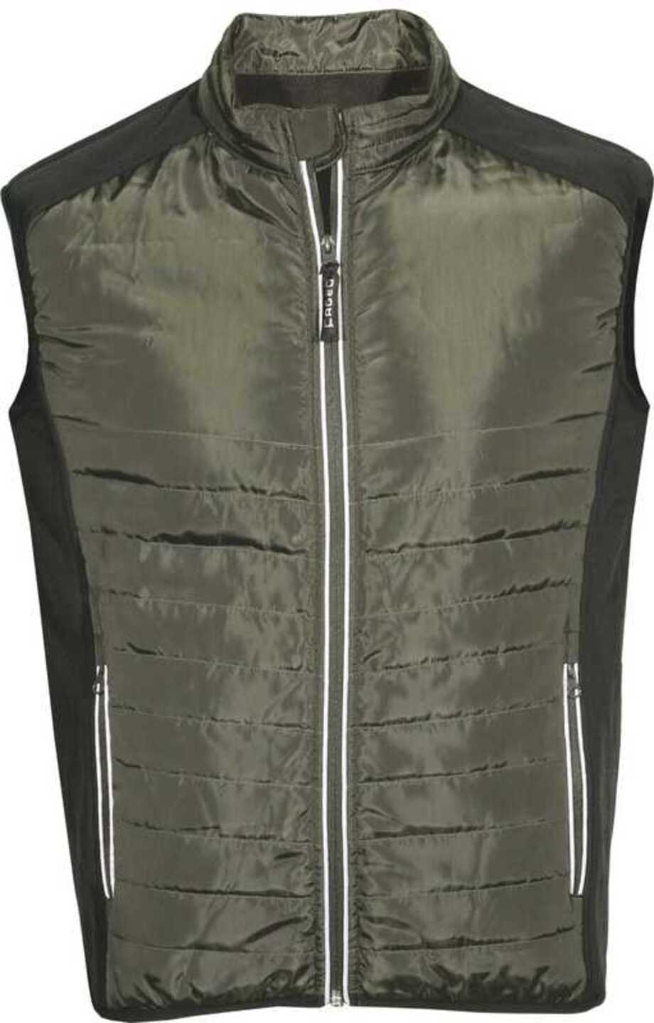 Bodywarmer front side padding polyester and soft shell on the side and all over the back . It has 2 zipper pockets and at the top of the central zipper it has a chin guard.