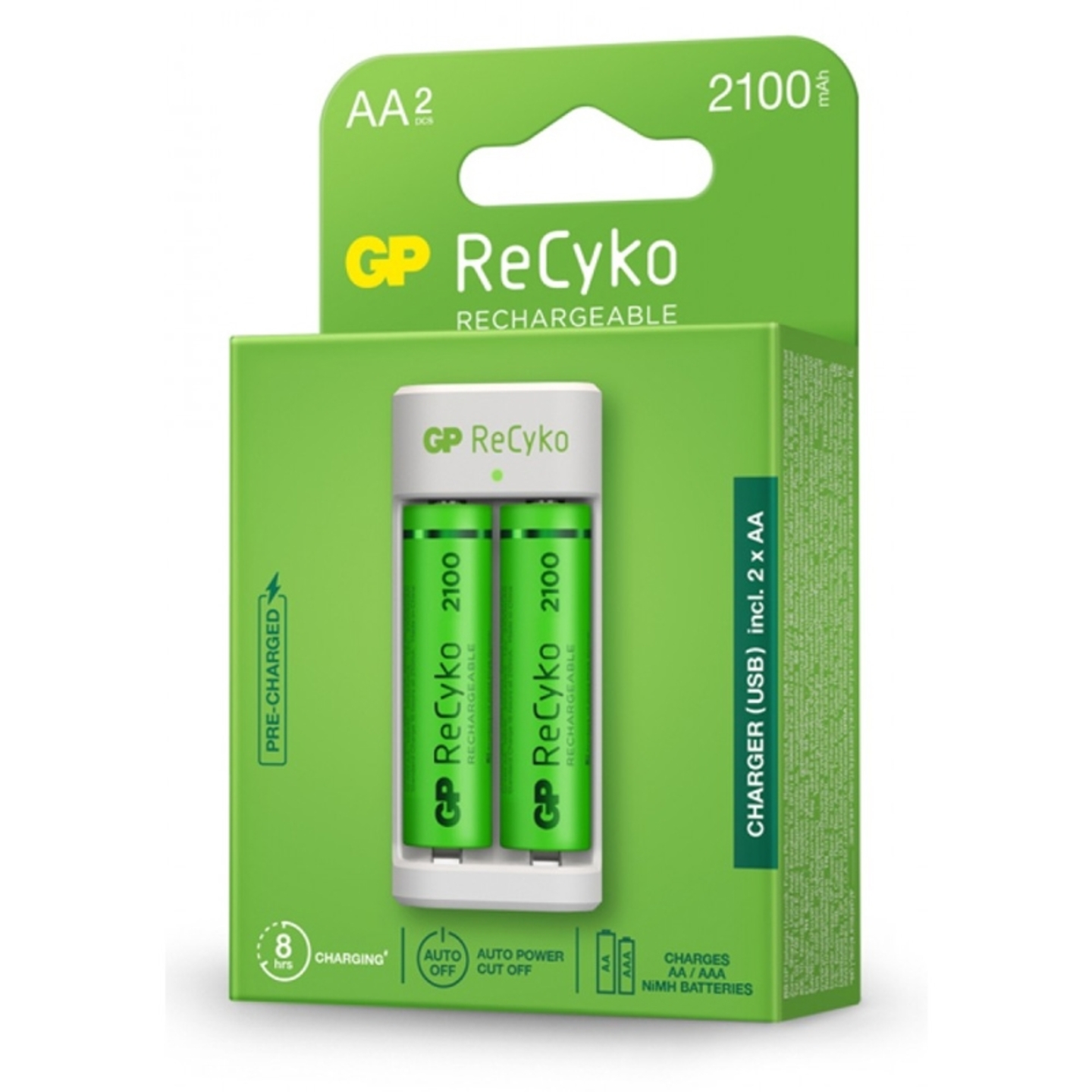GP Recyko USB charger with 2 AA 2100mAh rechargeable batteries. Includes the USB cable. Charges 2 AA batteries or 2 AAA batteries