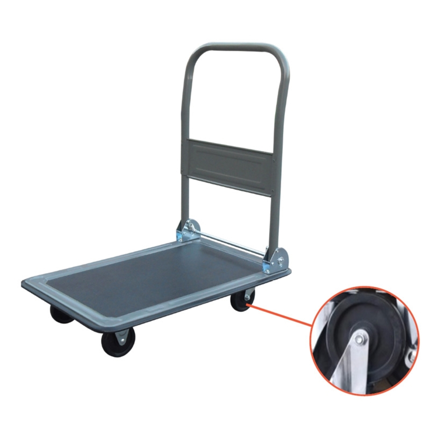 [Platform:] Dimension: 73X48cm Thickness: 0.5mm Material: steel with PVC surface [Wheel:] Dimension: 10X3.6cm, Φ100mm Material: plastic [Handle:] Material: steel Closed trolley dimension: 48 x 12 x 4 H74 cm Stroller weight: 7.4kg